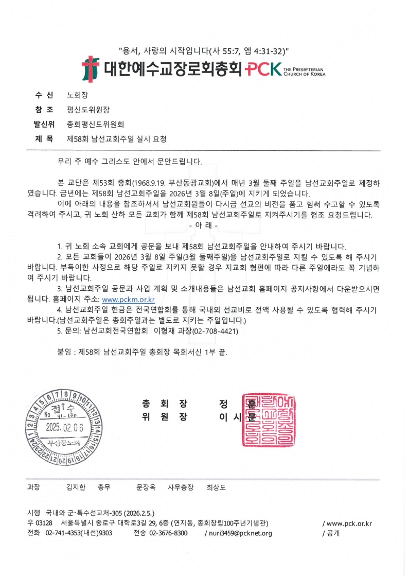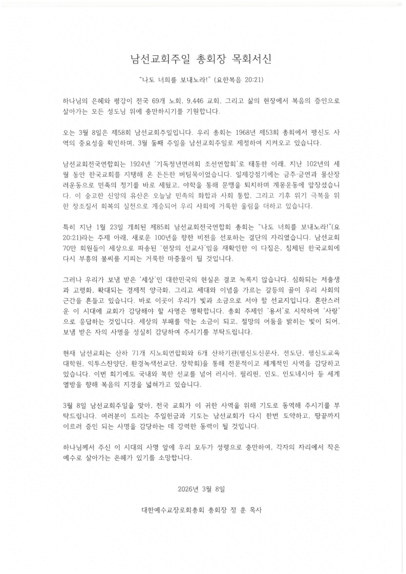 2026년 3월 8일은 총회 남선교회주일입니다.