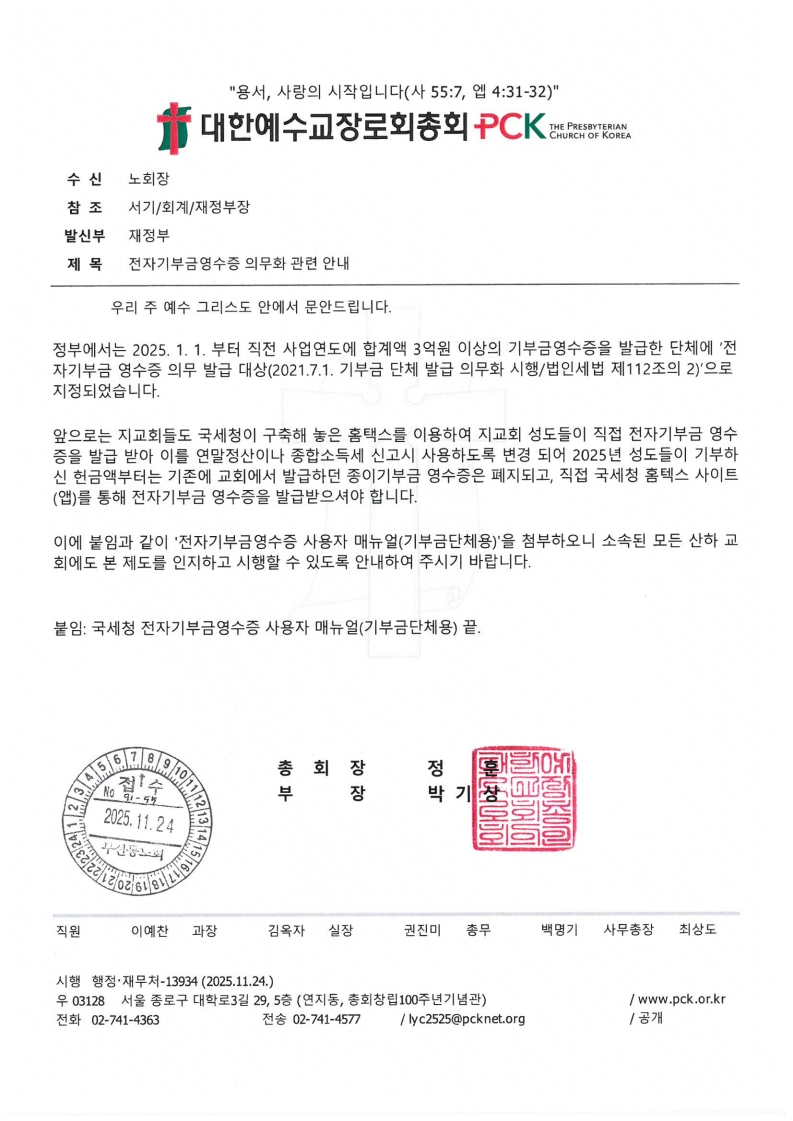 * 총회에서 보내온 전자기부금 영수증 의무화 관련 안내 공문입니다.
